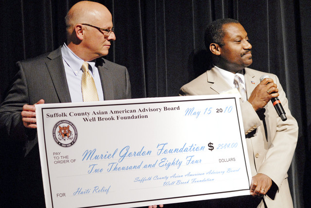 and Economic Development receives the check on behalf of Muriel Gordon Foundation from Ramon L. Villongco,MBA, Chairman of the Suffolk County Executive's Asian American Advisory Board presented during the 2nd Annual Asian Pacific American Heritage Month Celebration on May 15, 2010 held at the Charles B Wang Center at Stony Brook University for the Haiti Earthquake Victims Relief Project.