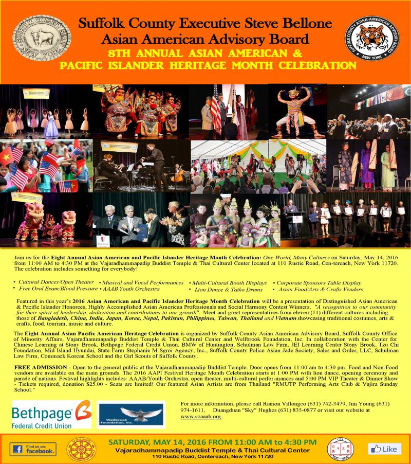 On behalf of the Suffolk County Asian American Advisory Board, I am pleased to welcome you to participate in our Eight Annual Asian American and Pacific Islander Heritage Month, themed “One World, Many Cultures” to take place on Saturday, May 14, 2016, from 1 pm to 5 pm, at the Vajaradhammapdip Buddhist Temple, Thai Cultural Center located at 110 Rustic Road, Centereach, NY 11720.
