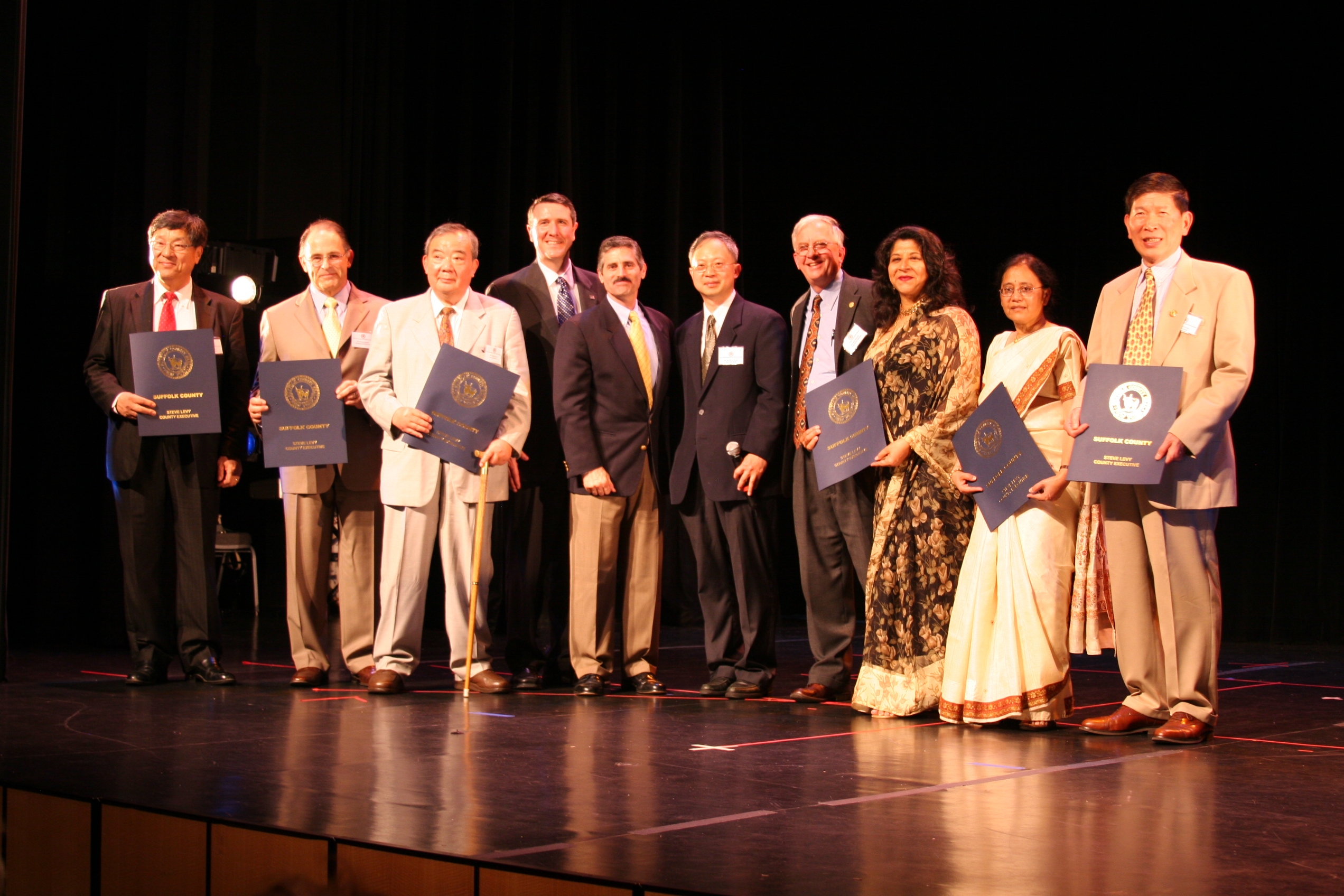 Mr. Kyu Ho Park, Dr. Samuel Arronson receiving an award for Dr. Satoshi Ozaki, Director of BNL, Dr. Shoj Kimura, Brookhaven Town Supervisor, Mark Lesko, Suffolk County Executive Steve Levy, Jim Young AAAB Chair, Suffolk County Legislator John Kennedy, Sunita Mukhi, Director Wang Center, Mrs. Vora received an award on behalf of Dr. Arvind Vora, Dr. Chung Chi Chou.